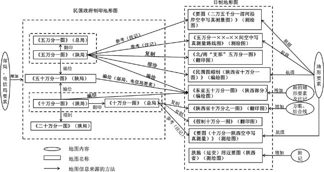 | 地图 类型 | 地图名称 | 理论 数量 | 现存 数量 | 各地藏 图数量 | 测图时间 | 制版时间 | 发行时间 | 复制时间 | 制版 单位 | 藏图地①(①因台湾收藏了多个机构的地形图资源,现藏图幅中有大量重复地图,本文统计的《陕西省十万分一图》、陕西省《北/南“支那”五万分一图》主要参考其地政司藏图,《要图(二万五千分一渭河沿岸空中写真测量图)》《要图(十万分一陕西空中写真测量)》《民国图缩制(陕西省十万分一图)》参考美国国会图书馆藏图(台湾扫描件),剩余地形图参考其人社中心藏图。) | ||