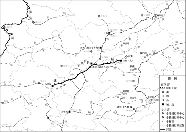 有赖于肆州长城考古调查的深入,笔者综合多种文献对马陵戍重作考订,进而判定肆州长城的走向。首先是马陵戍的地望。山西省文物局长城调查组在今宁武县、原平市实地勘查,将肆州长城遗址最西(南)端判定在宁武县榆庄乡(余庄乡)的榆树坪。⑧(⑧山西省文物局长城调查组:《东魏肆州长城》,《文物世界》2001年第3期。)榆树坪,属管涔山系。管涔山跨越宁武、五寨和岢岚等县,其走向自榆树坪继续向西南延伸至荷叶坪。荷叶坪是管涔山的最高峰,其南麓在岚漪河上游东川河北岸,是“肆州北山”的最西(南)端。与此对应,肆州长城遗迹亦沿“肆州北山”,即管涔山山脊盘亘交错,由榆树坪蜿蜒而上,经黄草梁、芦芽山至荷叶坪。考古工作者在荷叶坪发现肆州长城遗迹接连向西延伸进入岢岚县,经黄土坡、正虎沟,止于王家岔乡王家岔村东北约50米的山梁。①(①国家文物局主编、山西省文物局编制:《中国文物地图集·山西分册》中册,第655页。)王家岔乡王家岔村亦位于岚漪河上游东川河北岸、荷叶坪(管涔山)南麓,也是“肆州北山”最西(南)端。因此,透过肆州长城的遗迹分布、管涔山系的走向及王家岔乡王家岔村的地理方位推断,肆州长城的最西端马陵戍在王家岔乡王家岔村一带。