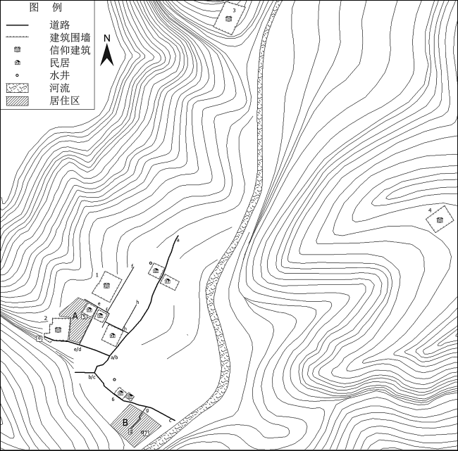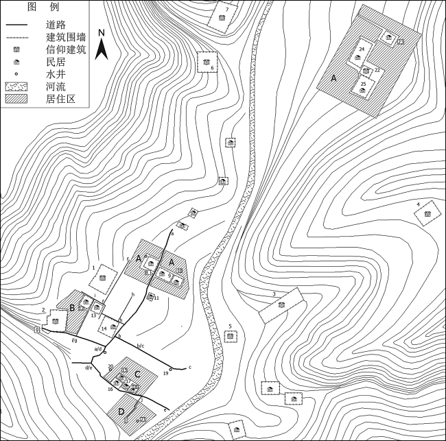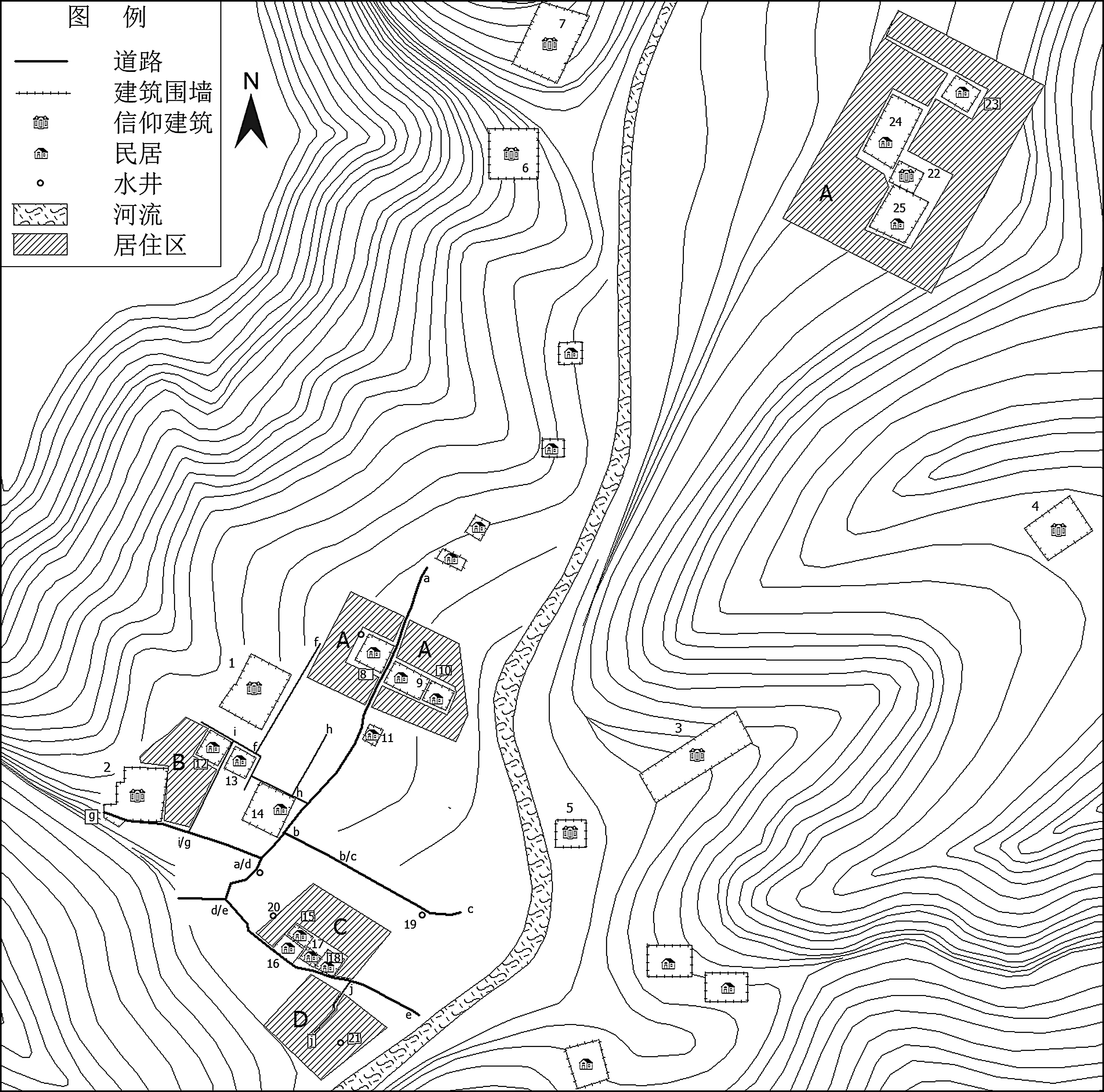 图3 明万历年间郭峪村落格局示意注: 1. 里馆;2. 汤帝庙;3. 白云观;4. 文昌阁;5. 河东庵;6. 北券;7. 山神庙;8. 陈家院;9. 恩进士大院;10. 西都世泽;11. 王重新老宅;12. 窦家院;13. 小狮院;14. 老狮院;15. 姑娘院;16. 厨房院; 17. 张家大宅;18. 张家二宅;19. 双钱井;20. 花园井;21. 卢家井;22. 陈氏宗祠;23. 树德院;24. 容山公府;25. 世德居;A. 陈氏居住区;B. 窦氏居住区;C. 张氏居住区;D. 卢氏居住区;a-a. 前街; b-b. 上街;c-c. 下街;d-d. 井圪洞;e-e. 南沟街;f-f. 馆上胡同;g-g. 庙圪台底;h-h. 仓圪洞;i-i. 窦家胡同;j-j. 卢家圪洞。以阿拉伯数字标示“屋舍、水井等建筑”,以大写英文字母标示“居住区”,以小写英文字母标示“街道起止点”。 资料来源: 底图源自中国城市规划设计研究院《晋城古堡申报世界文化遗产预备名单文本》(2020年7月)。 |