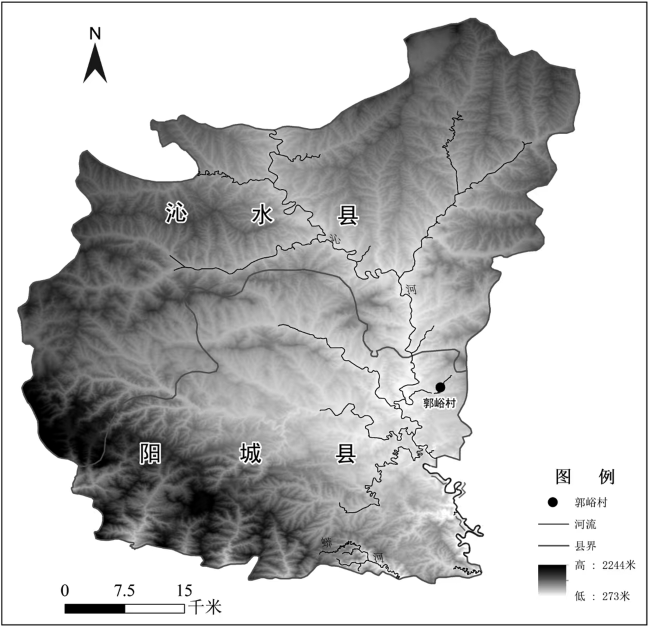 图1 郭峪村地理位置示意资料来源: 地理遥感生态网科学数据注册与出版系统(www.gisrs.cn) |