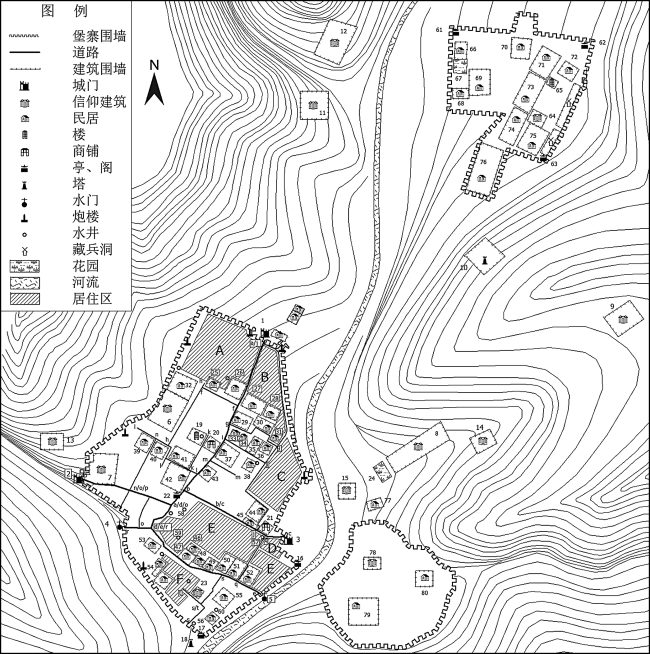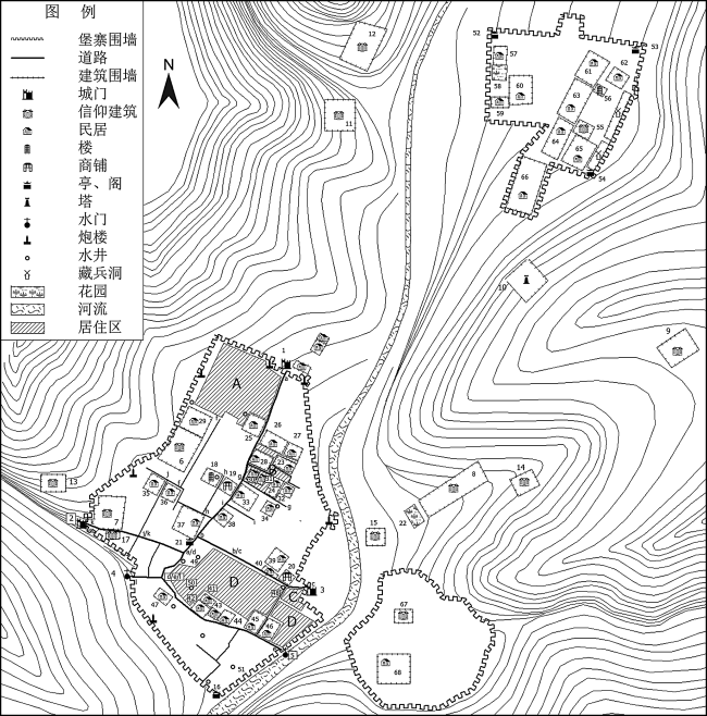图5 清雍正年间郭峪村落格局示意注: 1. 拱辰门;2. 永安门;3. 景阳门;4. 西水门;5. 金汤门;6. 文庙;7. 汤帝庙;8. 白云观;9. 文昌阁;10. 文峰塔;11. 北券;12. 西山庙;13. 白衣庵;14. 三教堂;15. 河东庵;16. 菩萨阁;17. 观音堂;18. 豫楼;19. 王家商铺;20. 正泰号货栈;21. 申明亭;22. 渔池院;23. 王维时宅院;24. 王启瑞院;25. 陈家院;26. 恩进士大院;27. 西都世泽;28. 王重新宅院;29. 容安斋;30. 王重新老宅;31. 王重新伙计院;32. 张拱辰故居;33. 秦静斋故居;34. 张我生院;35. 窦家院;36. 小狮院;37. 老狮院;38. 王家院;39. 张景星院;40. 王重新管家院;41. 姑娘院;42. 厨房院;43. 张家大宅;44. 张家二宅;45. 张家三宅;46. 张家四宅;47. 柴阴阳宅;48. 双钱井;49. 魏家井;50. 花园井;51. 卢家井;52. 望河亭;53. 春秋阁;54. 文昌阁;55. 陈氏宗祠;56. 河山楼;57. 小姐院;58. 西花园;59. 管家院;60. 大学士第;61. 麒麟院;62. 树德院;63. 容山公府;64. 御史府;65. 世德居;66. 南书院;67. 三大士殿;68. 侍郎府;A. 陈家后居住区;B. 王氏居住区;C. 店院后居住区;D. 张氏居住区;a-a. 前街;b-b. 上街(商业街);c-c. 下街(商业街);d-d. 井圪洞;e-e. 南沟街;f-f. 文庙胡同;g-g. 松木圪洞;h-h. 仓圪洞;i-i. 秦家圪洞;j-j. 窦家胡同;k-k. 庙圪台底;l-l. 水门里。以阿拉伯数字标示“屋舍、水井等建筑”,以大写英文字母标示“居住区”,以小写英文字母标示“街道起止点”。 资料来源: 底图源自中国城市规划设计研究院《晋城古堡申报世界文化遗产预备名单文本》(2020年7月)。 |