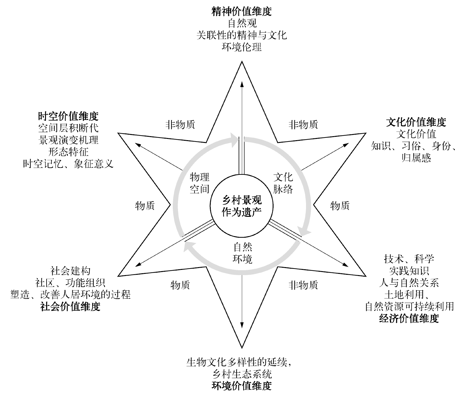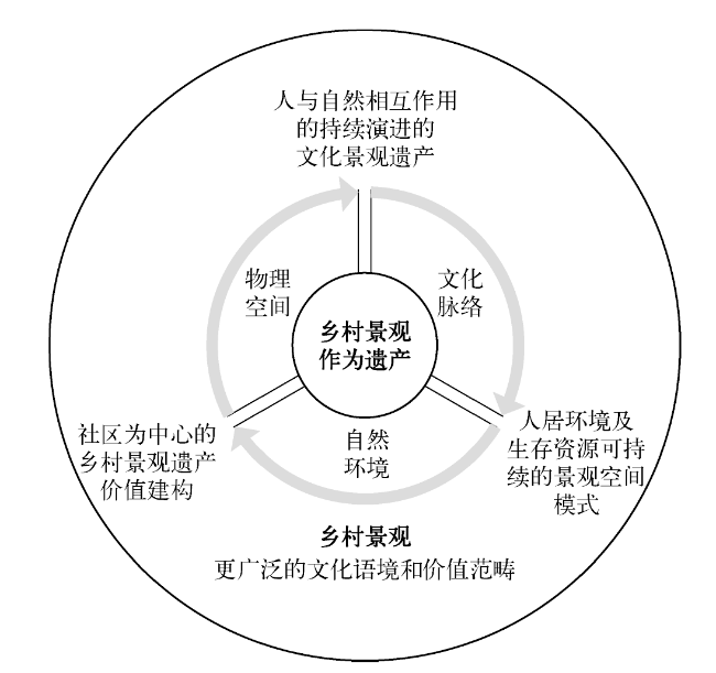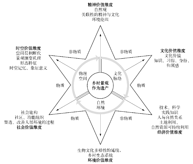 2017年,国际古遗址理事会通过了《关于乡村景观遗产的准则》,聚焦于“乡村景观作为遗产”的价值认定问题。乡村景观是持续演进的文化景观,其遗产价值视角呈现出从历史性向可持续性转变的趋势,乡村各类自然资源以可持续利用方式为载体的整体生产、生态系统价值尤其值得关注。在《实施<世界遗产公约>操作指南》“文化景观类别”遗产价值评价标准支撑下,《关于乡村景观遗产的准则》旨在强调乡村景观作为遗产在全球范围内的普遍性和重要性,以及乡村景观保护在全球可持续发展中的关键使命。通过全面回顾国际乡村景观遗产保护理论,梳理价值认知的变迁历程,总结理解“乡村景观作为遗产”的六维价值系统理论框架。