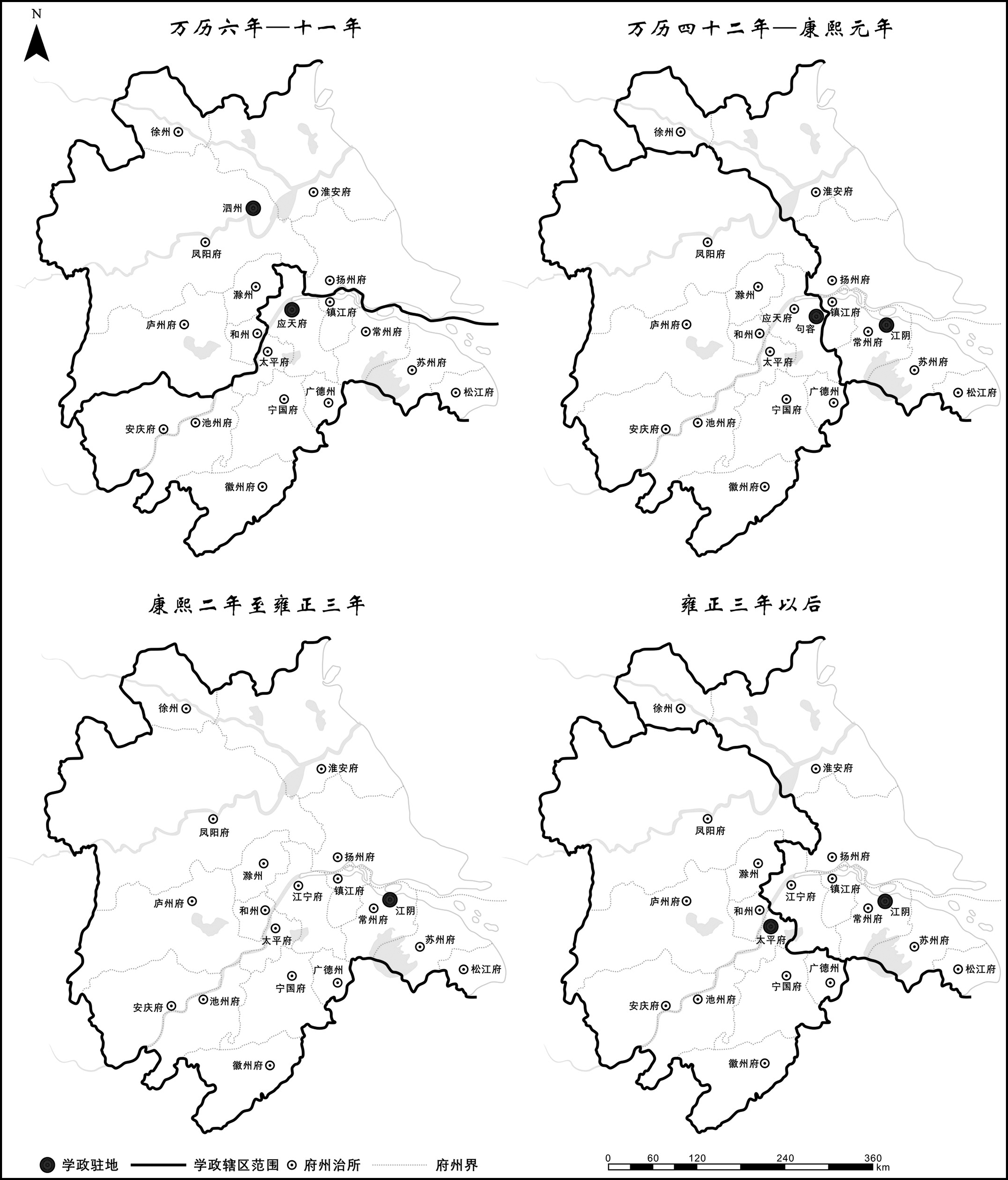明清时期的学政驻地一般位于省城,但亦有几处例外: 顺天学政曾驻易州,乾隆以降长驻京师,而非通州;上江学政驻句容、江苏学政驻江阴、安徽学政驻当涂,则因其辖区不断调整;陕西学政驻三原县,与年羹尧有一定关联。此外,浙江学政曾驻嘉兴、山东学政曾驻青州、广东肇高学政驻肇庆亦较特殊。上述学政驻地的位置选择与学政制度演进、辖区变动、乡试考点位置密切相关,也受房舍损坏、战乱乃至主政者好恶等偶发因素影响。