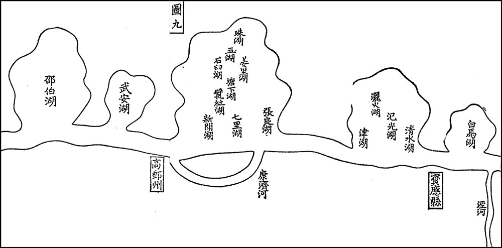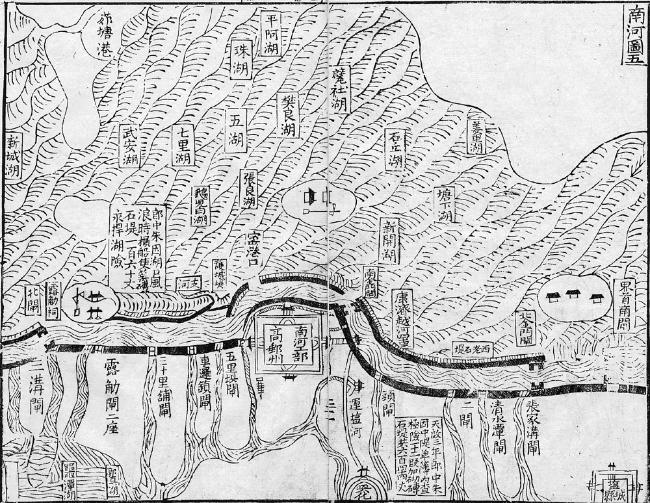 高邮湖,弘治三年,白公以七十余万金成康济河,商诚便也。第不当东绕围民田一万八千亩,康济与湖通,水如城,田若盂。不得已于月河之底,沉三涵洞,穿月河而东泄,船行洞之上方。未七十年,松板洞窒,不复能穿月河,水汇田中,是老堤之东又益一万八千亩之田湖也。左哉,左哉。老堤如线,浸万顷中,八面受敌,而大堤坏。中堤故卑薄,大湖拥田湖,风涛击之,而中堤坏。二堤俱坏,则康济东堤直弱缯当万石之弩耳,岂不危哉? ⑥( ⑥〔明〕万恭著,朱更翎整编:《治水筌蹄》卷上,第3—4页。)