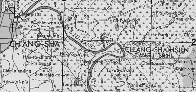 图10所示,地图所标机场(左上横线处)即协操坪机场所在。该图无大圆洲机场却有协操坪机场,说明美军应根据1944年的航测结果和情报修正过,但该图编制时协操坪机场已改建体育场,大托铺机场也于1954年竣工,说明美国和台湾当局都不清楚这一消息,地图内容停滞在1949年。比长沙机场更明确的依据是长沙县治所在地。1949年7月长沙县人民政府在金井成立,8月迁榔梨市,同月长沙和平解放。1950年3月长沙县政府迁潘家坪, 1996年迁至今星沙镇。地图中的长沙县治标注于榔梨市,说明国民党在长沙解放前后数月间尚能获取相关情报,待湖南局势迅速稳定后,此类情报未再更新。